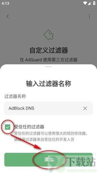 5、稍微等一会儿哈,它会弹出来一个确认框,问你信不信任这个规则,勾上“受信任的过滤器”,再点“添加”。