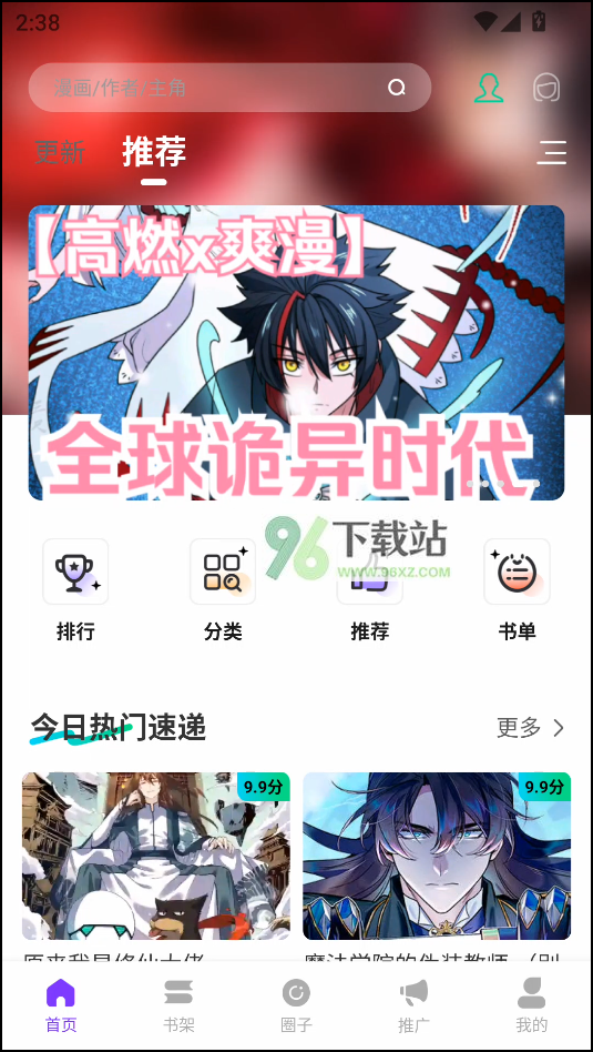 1、在软件首页,我们能够看到排行、分类、推荐、书单以及当下热门漫画相关的板块。
