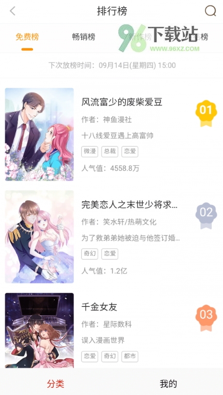 所有漫画按题材分成多个大类,比如恋爱、冒险、悬疑、校园等,点进去就能筛选。
