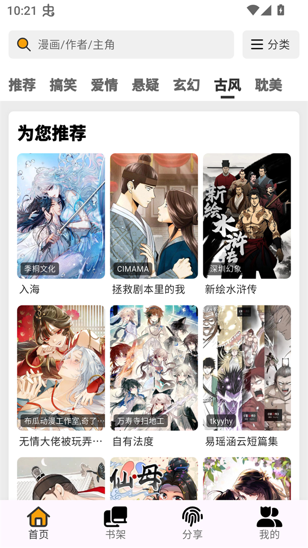 1、下载安装好软件后直接点开,首页就是琳琅满目的漫画推荐,你可以先按分类去找找自己喜欢的。