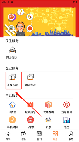 2、注册完登录进去,底部有个“服务”按钮,点进去就能看到各种实用功能,像在线答题、便民查询这些都在里面。