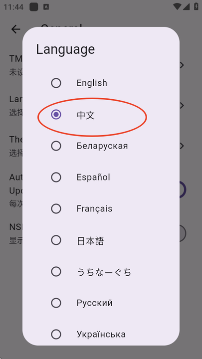 4、在语言列表里选择“简体中文”,界面会立即切换成中文;