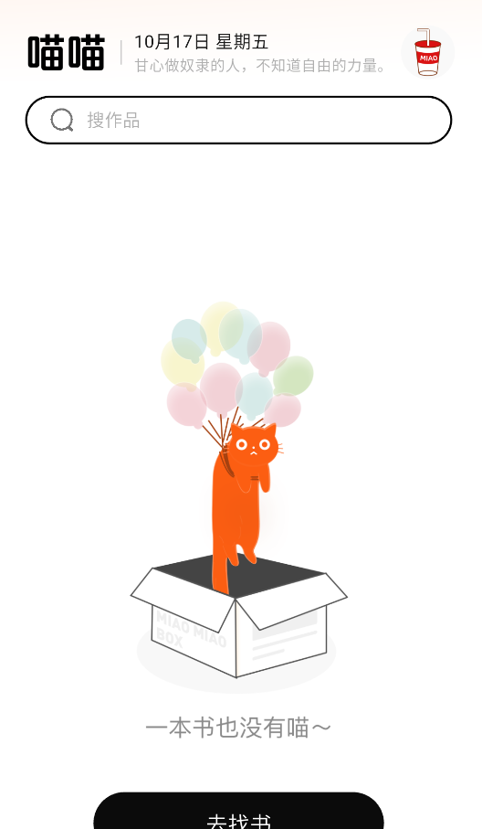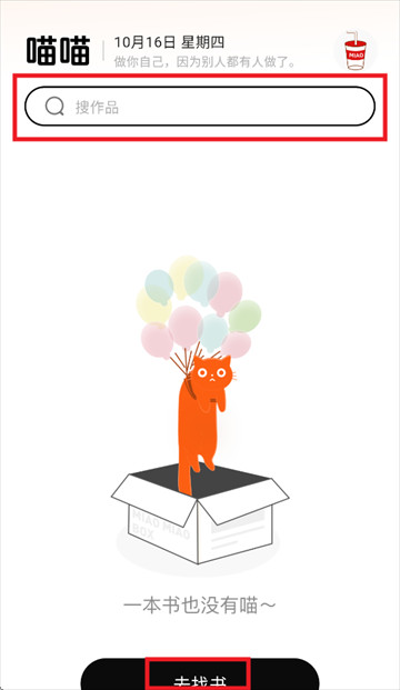 1、启动喵小乐后,点首页的“找书”按钮,或者直接点顶部那个搜索框就行。