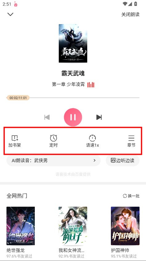 3、开始播放后,你还能在听书界面调整语速、设置定时关闭、跳转章节,或者顺手把书加到书架里,操作挺顺手的。