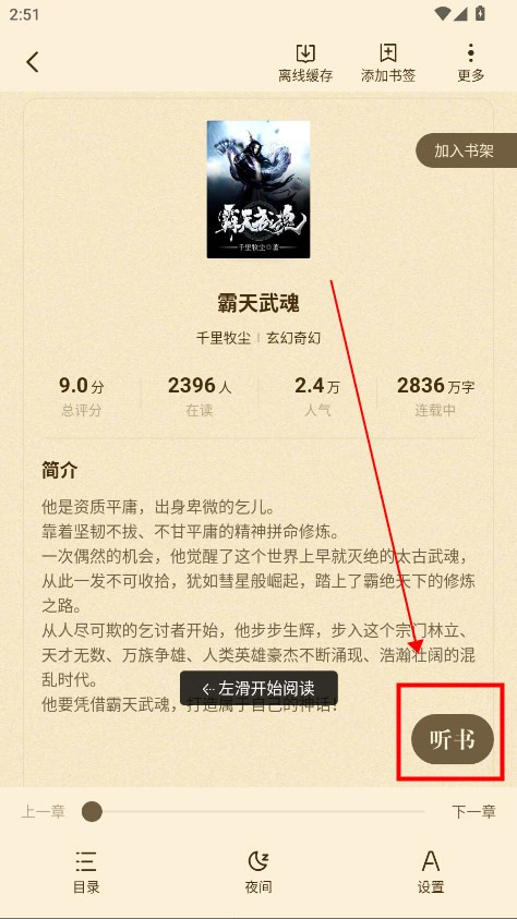 2、进入阅读页面后,留意右下角那个“听书”按钮,轻轻一点就切换成语音模式了。