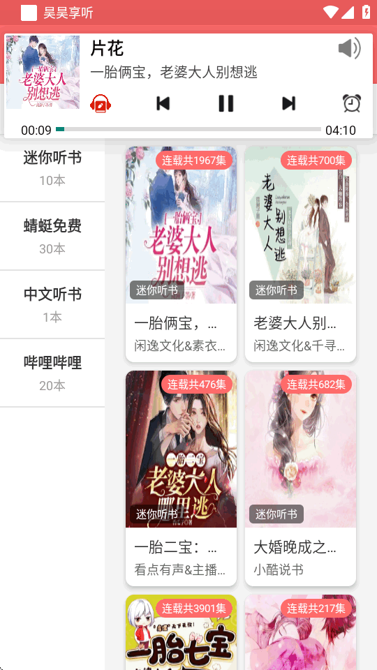 昊昊享听一打开就能直接用,压根不用注册账号,省去了不少麻烦。里面的内容特别全,不管是热门小说、经典戏曲,还是音乐电台、评书相声,基本都能搜到完整版,想听哪段点开就播。它还整合了好几个听书平台的资源,像迷你听书、爱听书网这些,你可以在不同源里切换着找,哪个清晰稳定就用哪个。连载更新也跟得挺紧,基本上和官方同步,追更不用干等着。