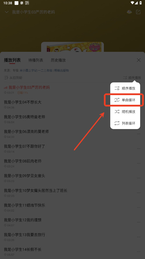 3.在弹出的菜单里选“单曲循环”,当前这集就会一直重复播放