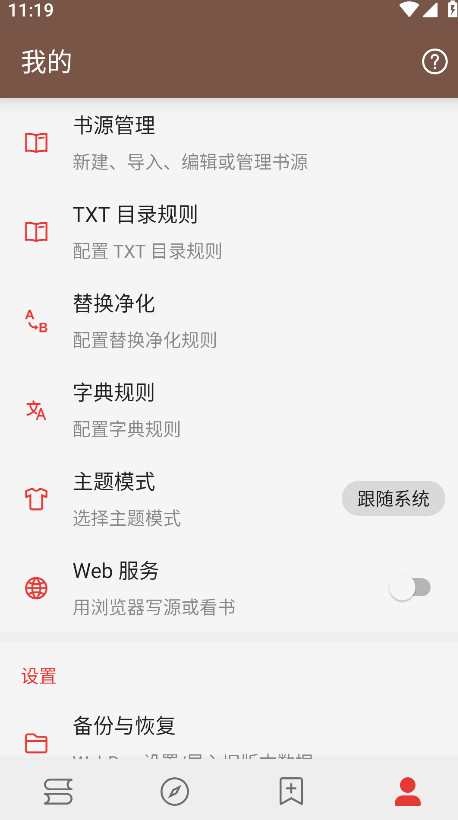 1、先打开阅读App,点右下角“我的”,再点顶部的“书源管理”