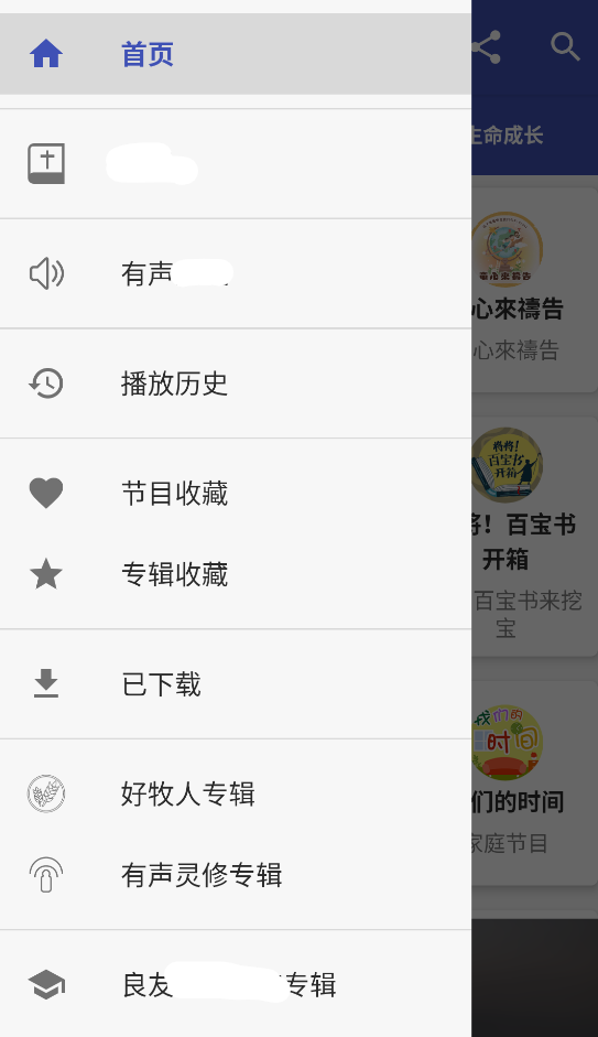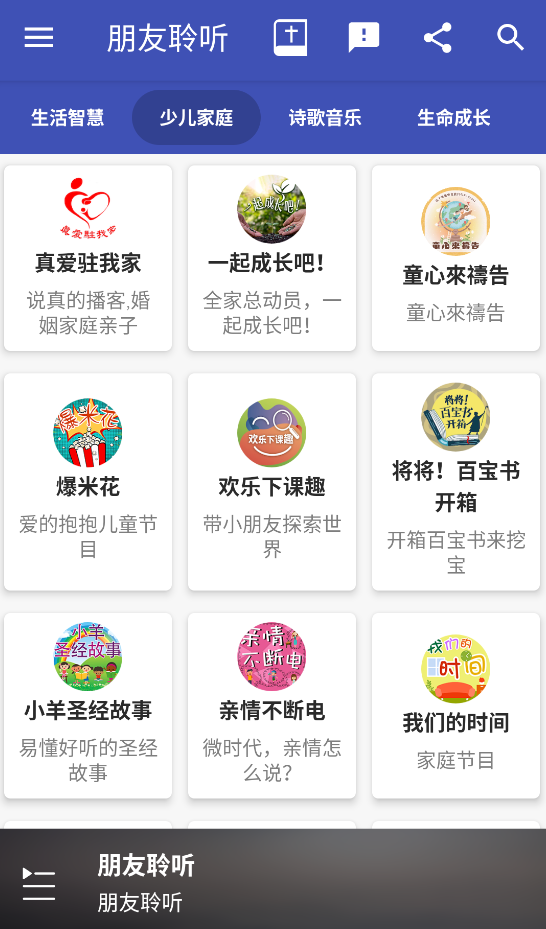 2、首页会推荐一堆热门频道,像家庭关系、儿童故事、信仰分享这些,挑感兴趣的点进去就行