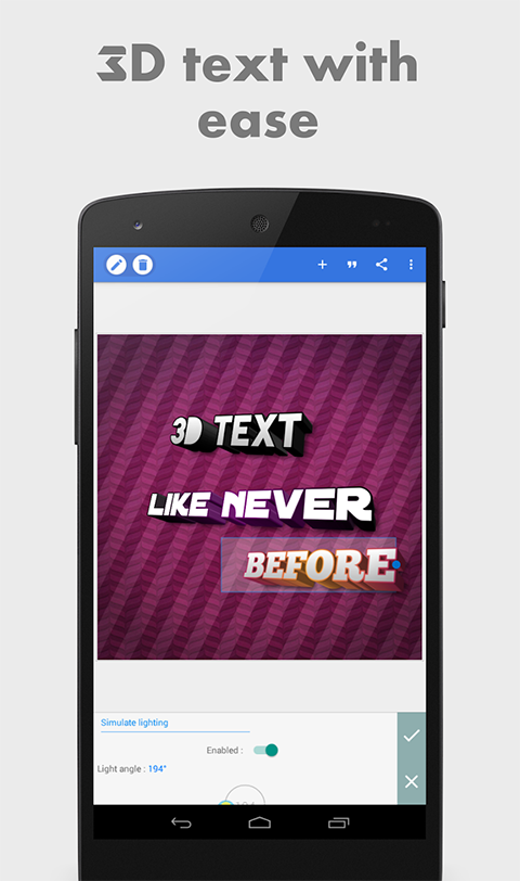 PixelLab APP真是手机上P图玩文字的超级好玩意儿,界面干净不乱七八糟,手残党几分钟就上手出作品,里面字体贴纸滤镜特效素材多到挑花眼,随便加3D文字阴影浮雕反射这些效果,文字瞬间立体炫酷不平庸,抠图换背景透视变形绘画涂鸦全随便搞,表情包海报头像签名图几步出大片,保存项目随时回改不丢灵感,分享社交一键发出去秀创意超爽快,很多爱美爱玩的朋友天天开着它折腾照片,日常朋友圈出片全靠它加持,玩着玩着设计感就上来了,手机摄影后期不费脑不累眼,日子过得有创意多点小惊喜,没这个APP总觉得图片太平淡没亮点。