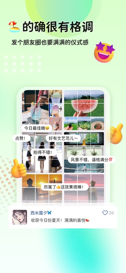 大家可以把自己相册里的照片传上去,然后在上面随便添加文字或者各种可爱的小贴纸,还能自由调整照片的位置和大小。