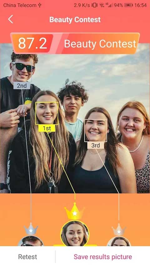 多张照片一起上传比对,App算出排名顺序,还给出两人五官对比的详细报告。