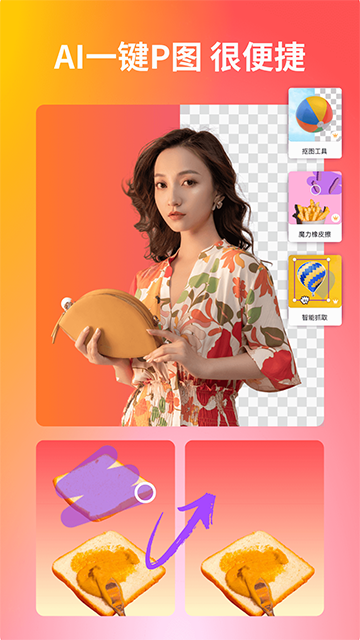 图片处理也不用切出去找别的软件,抠背景、修瑕疵、扩展画布这些功能全在App里搞定,连文字排版都会自动对齐,拖一拖就整齐了。