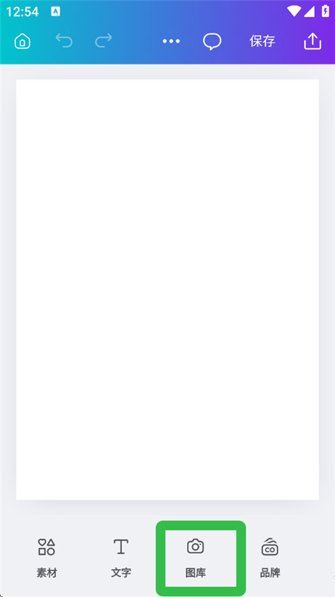 先打开Canva可画App,进入你正在做的设计页面,点底部菜单里的【图库】按钮。