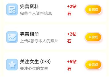 1、新手任务:注册后完成引导任务(如完善资料、首次打招呼等),可一次性领取大量钻石奖励。