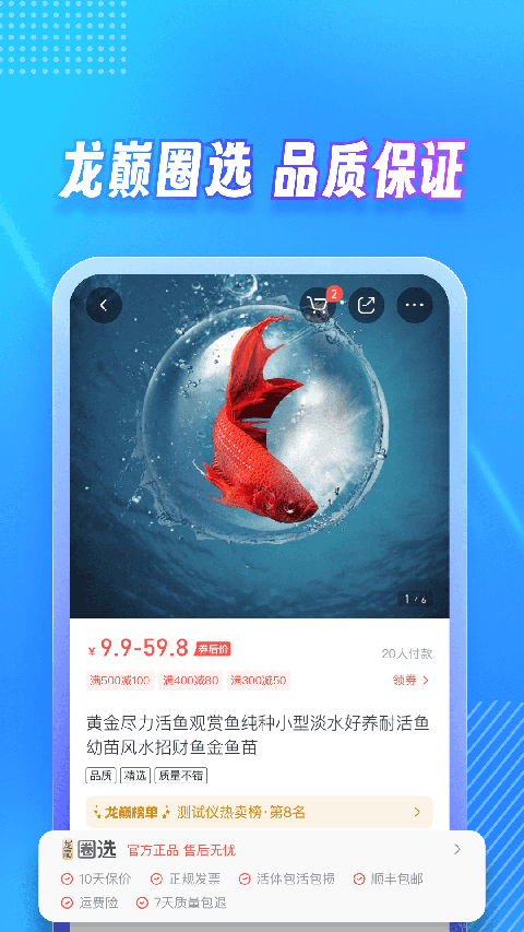 4、逛商城点对应tab,分类清晰挑饲料鱼缸器材,活动页抢福利下单支付超快到货稳。