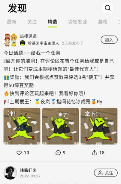 1、这软件主打的就是“学梗、造梗、玩梗”三件套,目标是做成一个聚集各种抽象文化爱好者的线上据点,氛围轻松又带点沙雕感。