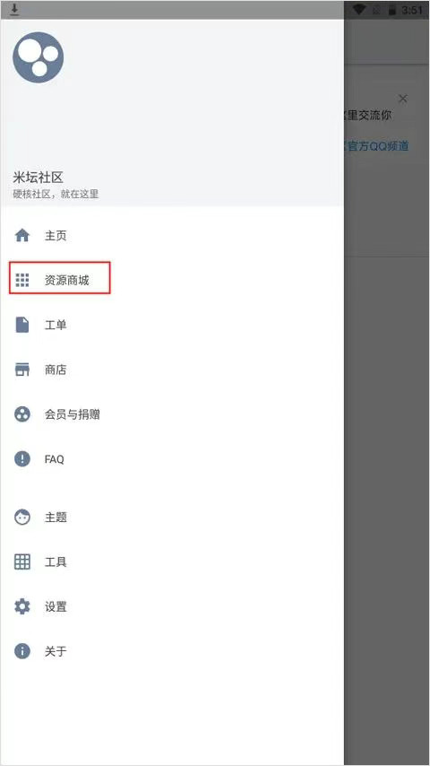 1、先打开米坛社区App,点一下左上角那个三条横线的菜单图标,接着找到并进入“资源商城”。