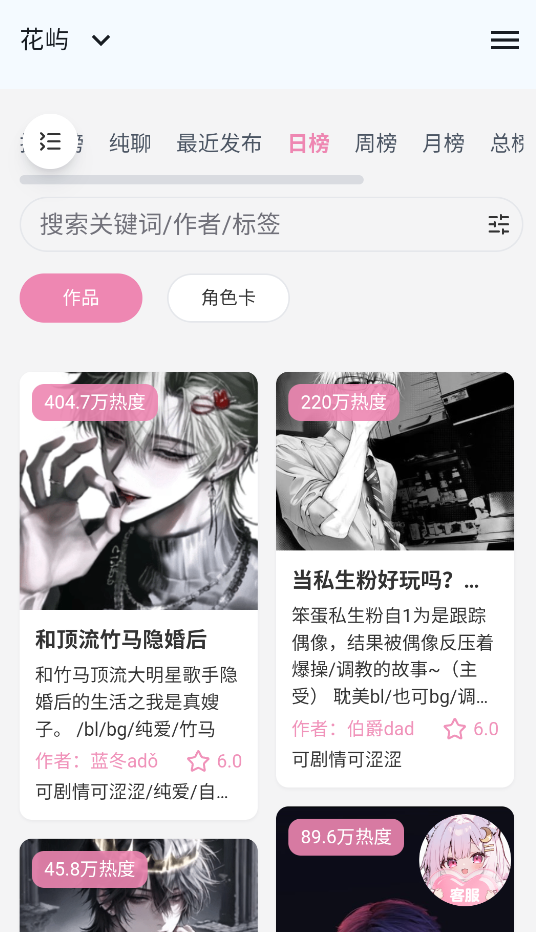4、搜角色很方便,输关键词、作者名或者标签就能快速找到想聊的那个