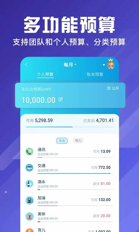 一个账本里多人一起设预算,可以按天、月、年或者不同类别控制开销,超支马上提醒。
