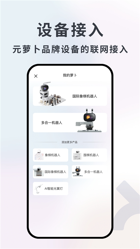 元萝卜App是上海元罗卜智能科技有限公司元萝卜家用机器人品牌的手机管家,专为那些买了AI下棋机器人或者智能台灯的爸妈和小棋手准备的,现在象棋围棋国际象棋这些机器人卖得挺火,很多人家都放一台让孩子练棋涨段位啥的,APP这东西用着简单,基本买回家扫个码连上WiFi就能玩,家长上班在外也能远程看孩子下棋进度、对局记录,还能分享给老师或者棋友圈炫耀,特别适合6岁以上小孩,从入门到大师级都能陪练,AI棋力分25级啥都有,不会觉得太简单或者太虐,夏天冬天开着空调对坐一局,培养专注力和逻辑思维比上网课强多了,商汤的视觉AI牛,机器人抓棋子稳稳的毫米级精度,APP里数据一目了然,很多人说用半年孩子棋力蹭蹭上涨,亲子互动也多了,值回票价。