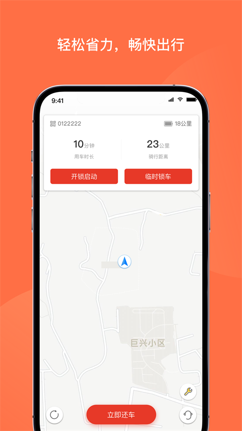 首页地图显示附近可用车辆位置、电量、类型,一眼找到最近的助力车,找车不费劲。