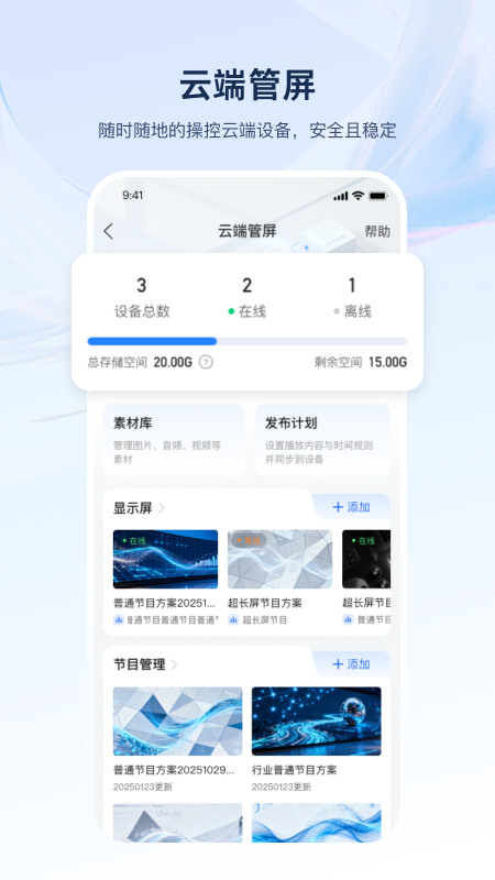 2、依托云端技术让远程操控变得非常稳定,哪怕人不在现场也能放心地管理远处的屏幕设备。