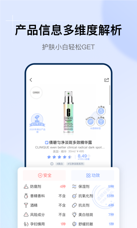 扫码或搜产品名,成分列表安全评估功效全解析,评级直观帮你快速判断值不值买。