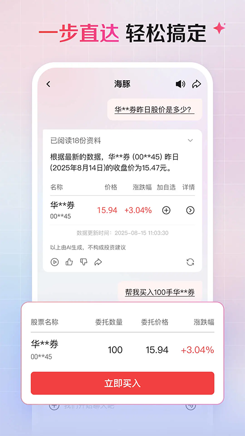 海豚股票app是炒股朋友们手机里最靠谱的行情小助手,很多人在股市里总觉得信息来得慢、机会抓不住、分析乱七八糟,用了它直接打开就能看到毫秒级刷新的沪深美股数据,股价涨跌成交量这些关键数字看得清清楚楚,智能盯盘50多项事件一有动静手机就叮,股价拉升超大单卖出这些不漏掉,帮你抢先抓时机不后悔,策略选股大数据AI量化全用上,熊市短打布林通道欧奈尔这些模板直接套,热股价值股挖得准不瞎买,K线自动标记信号压力支撑位,走势变化解析得明明白白,操作节奏稳不慌张,新人注册完任务还能免费拿2888元涨停龙头战法,小白快速上手不迷路,界面清爽不乱,头条账号登录自选股同步,资讯个性化推个股新闻不淹没,用了之后你会发现,炒股从慌张乱追变成有数据有策略,机会抓得住钱赚得稳,日子过得踏实又带劲儿,下载后基本每天开盘闭盘都会打开瞅瞅行情和盯盘,投资路越走越顺手了。