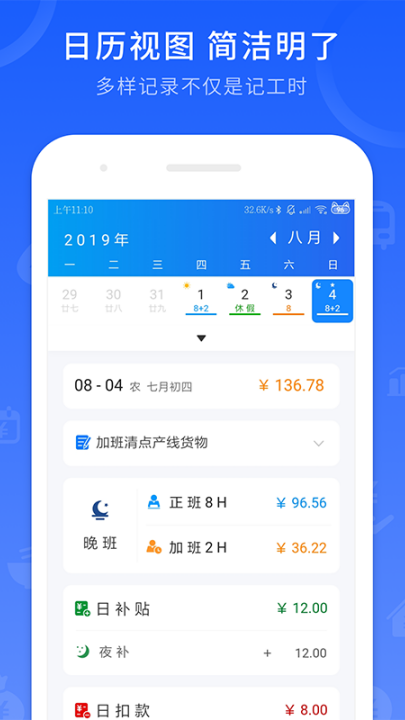 1、日历视图设计得非常直观,哪天干了活哪天休息一眼就能看出来,查以前的记录也特别方便。