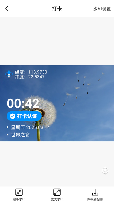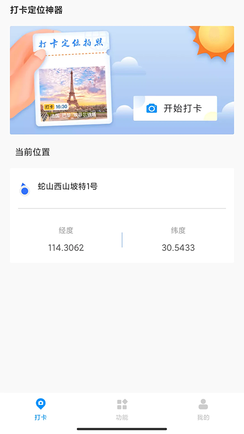 1、打开应用后,点击打卡按钮,即可拍摄或从相册选择照片来记录当前位置。