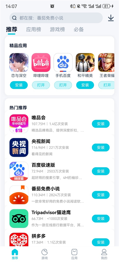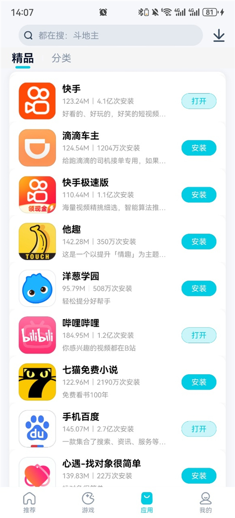 应用、游戏、工具、社交分栏摆开,顶部搜索栏输关键词秒出结果,模糊匹配也能找到目标。
