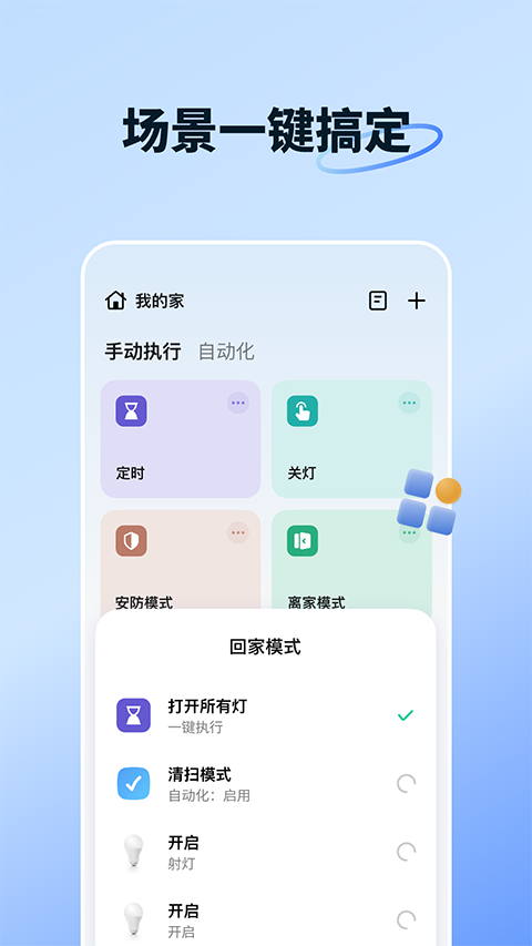 无论身在何处,都可以通过手机远程操作已连接智能设备的开关与功能。