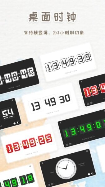 多种数字和指针皮肤可选,横竖屏自适应,手机架起来就是一台电子钟,看时间不用解锁。
