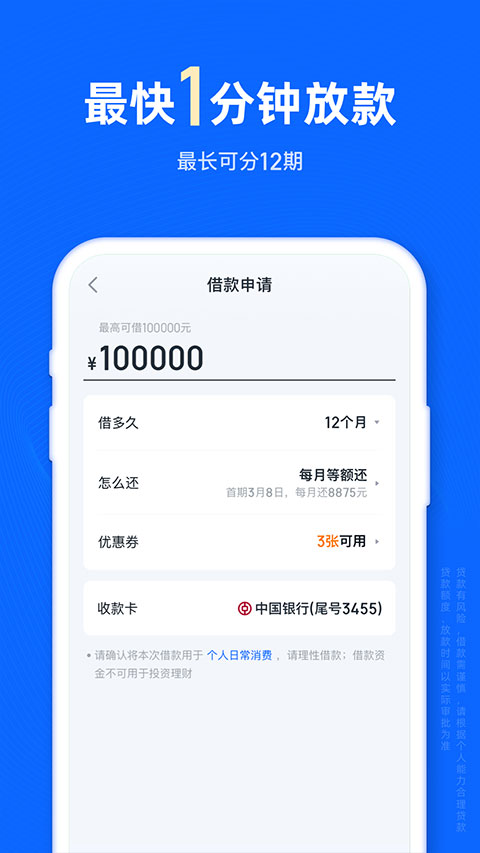 分3、6、12期随便挑灵活还,按时还款信用涨额度更高借钱更轻松。