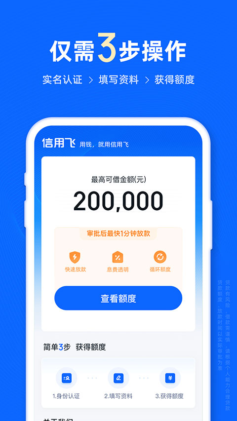 信用飞app就是个特别靠谱的借钱小助手,背后有央企南航资本控股,还跟招商银行中国银行这些大银行合作,纯线上操作不用跑银行填一堆表,最高能借20万,年化利率从6.5%起步,适合出门旅行、家里装修、孩子上学这些花钱的地方用,审批30秒放款1分钟到账快得飞起,不用担心资金周转卡壳,数据全程加密用着心里踏实不怕漏,业务正规有牌照不属于高利贷,借钱这事儿终于没那么愁人了,平时手头紧了打开手机点点事儿就办好,生活节奏一下就顺溜了不少,信用飞app用着真省心,天天有需要借钱的兄弟姐妹们下个试试准觉得这平台贴心,钱到手快日子过得踏实又自在不慌张了。