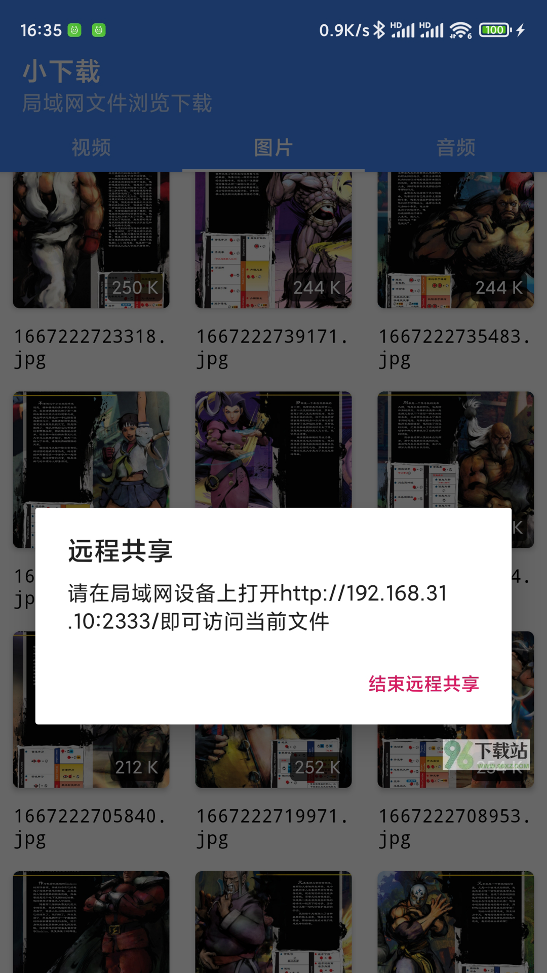 3、选好之后点底下那个分享按钮,会跳出一个提示框,里面有一串数字地址,比如192.168.x.x:8080这种。