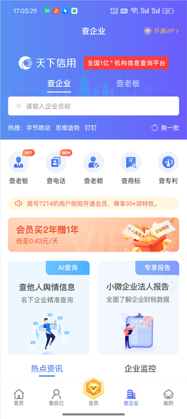 1、打开天下信用App后进入主界面,点击“查企业”功能,页面顶部就有搜索框可以直接输入企业名称进行检索。