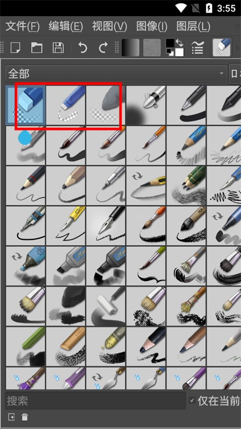 橡皮擦其实也是笔刷的一种。在笔刷列表里找带橡皮图标的,或者直接把当前笔刷切换到“擦除模式”——这样同一个工具既能画又能擦,不用来回切换。