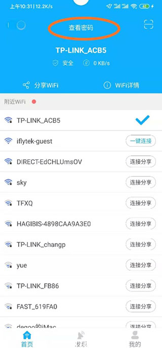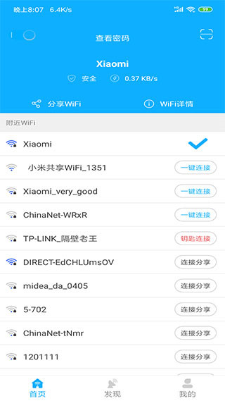 1、安装完打开应用,首页会列出周围所有可检测到的WiFi信号,已经保存过的网络会标出来,点一下就能重连。