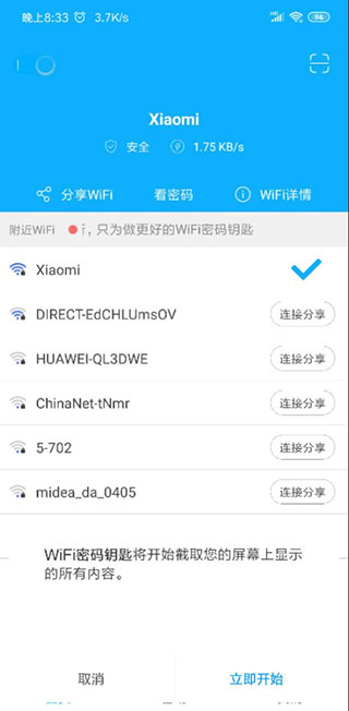 4、首次使用时系统会提示截屏权限,这是为了读取WiFi详情页的信息,点“立即开始”就行,后续操作基本全自动。