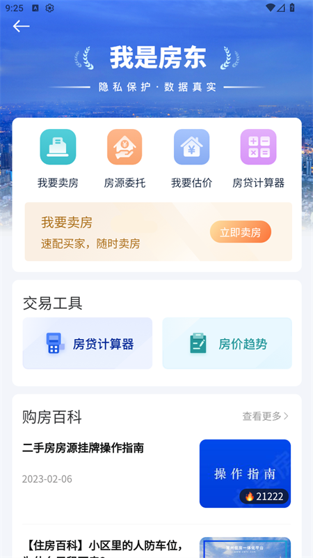 4、一站式服务:支持业主自主卖房、出租,自带专业房贷计算器,更有全方位的房产衍生服务。