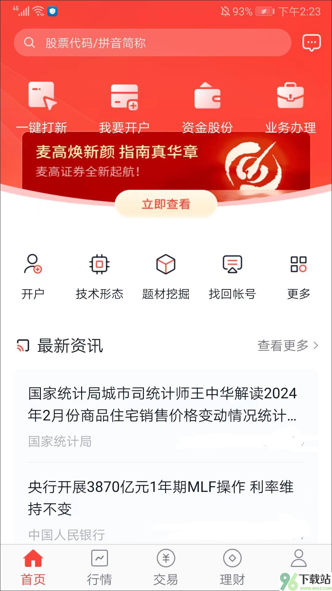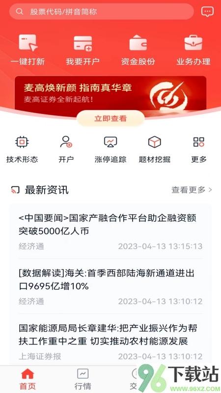 1、启动麦高证券APP后,主界面会呈现首页、行情、交易、理财和“我的”五大模块。首页集中了常用功能,比如一键打新、新开户入口、各类业务办理以及资金与持仓查询,点进去就能直接操作。