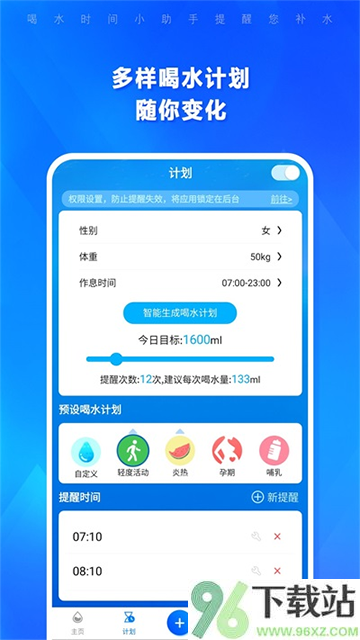 喝水时间app是一款专为日常补水设计的提醒工具。界面干净清爽,操作逻辑清晰,用户能轻松设定专属的饮水计划。它会根据你输入的性别、体重和作息习惯,智能推荐每天该喝多少水,并在合适的时间点温柔提醒你拿起水杯。如果搭配智能手表使用,还能同步记录运动数据,让健康管理更连贯自然。