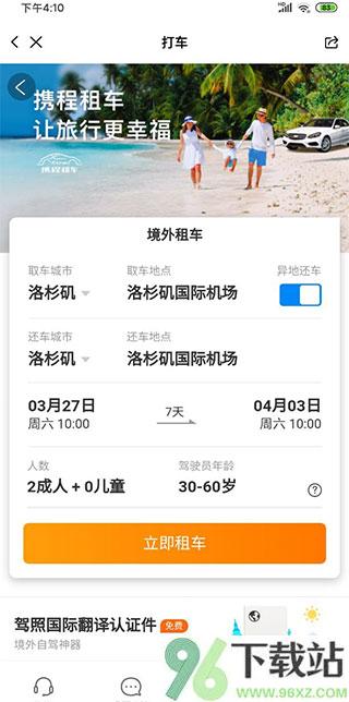 4、填好取还车时间、地点等基本信息,点“立即租车”;