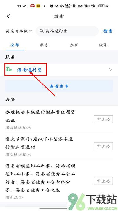2、在顶部搜索框里直接输入“海南通行费”,系统会自动弹出相关服务;