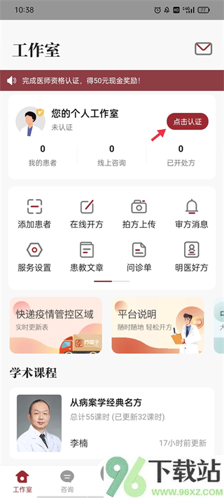 3、进去后先看到自己的个人工作室,这时候记得点“认证”按钮,把执业资质走完流程。