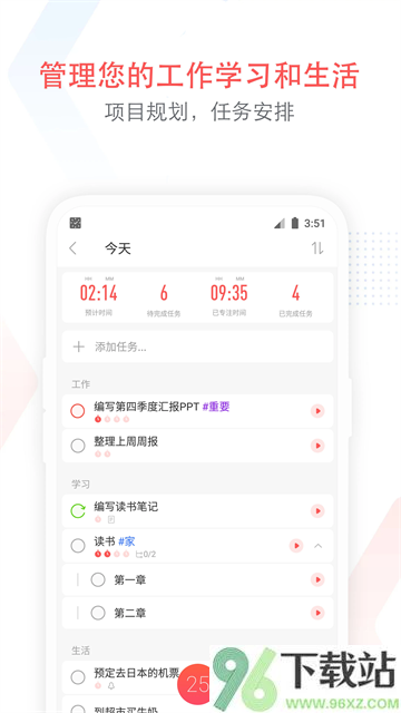 不管是临时想到的待办事项,还是长期目标,都能放进任务清单里分类整理。每个任务可以设提醒、定重复周期(比如每天背单词)、预估需要几个番茄钟完成,还能拆成多个子任务一步步搞定。加上备注、标上优先级颜色,重要事情一眼就能认出来,再也不怕遗漏或拖延。