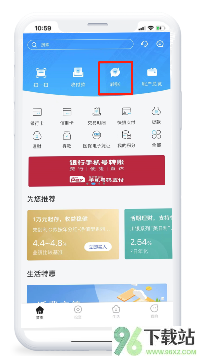 1. 打开“四川银行”App,登录后回到首页,点进“转账”功能;