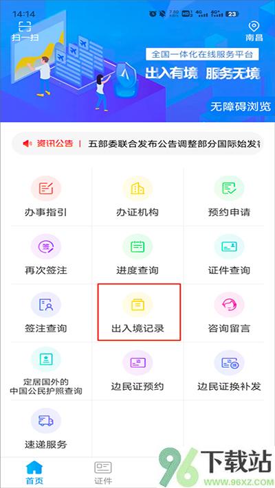 1、打开App首页,找到“出入境记录”入口点进去;